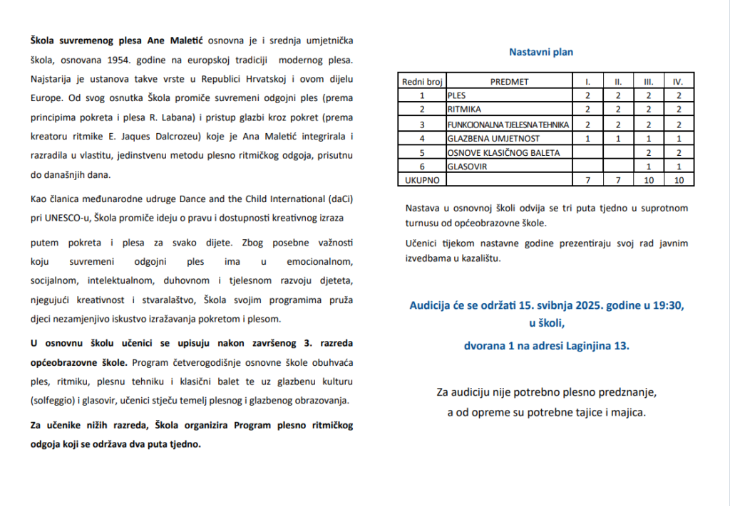 Audicija će se održati 15. svibnja 2025. u 19:30, dvorana 1 na adresi Laginjina 13, a od opreme su potrebne tajice i majica.
