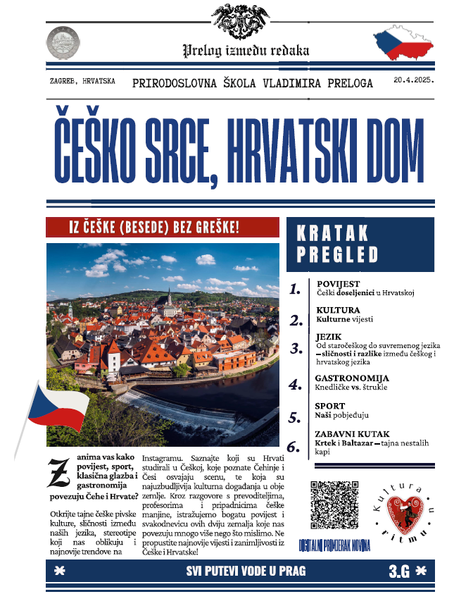 Za to su vrijeme učenici 3.g razreda Prirodoslovne škole Vladimira Preloga napravili školske novine Prelog između redaka: Češko srce, hrvatski dom (urednica Kaja, grafički dizajn Nela, lektura Klara). Tako su prelogovci na 32 stranice zapisali intervjue, napravili reportaže, glazbene priče i brojne druge stvari koje ruše stereotipe, a digitalni primjerak školskih novina prolistajte na POVEZNICI.