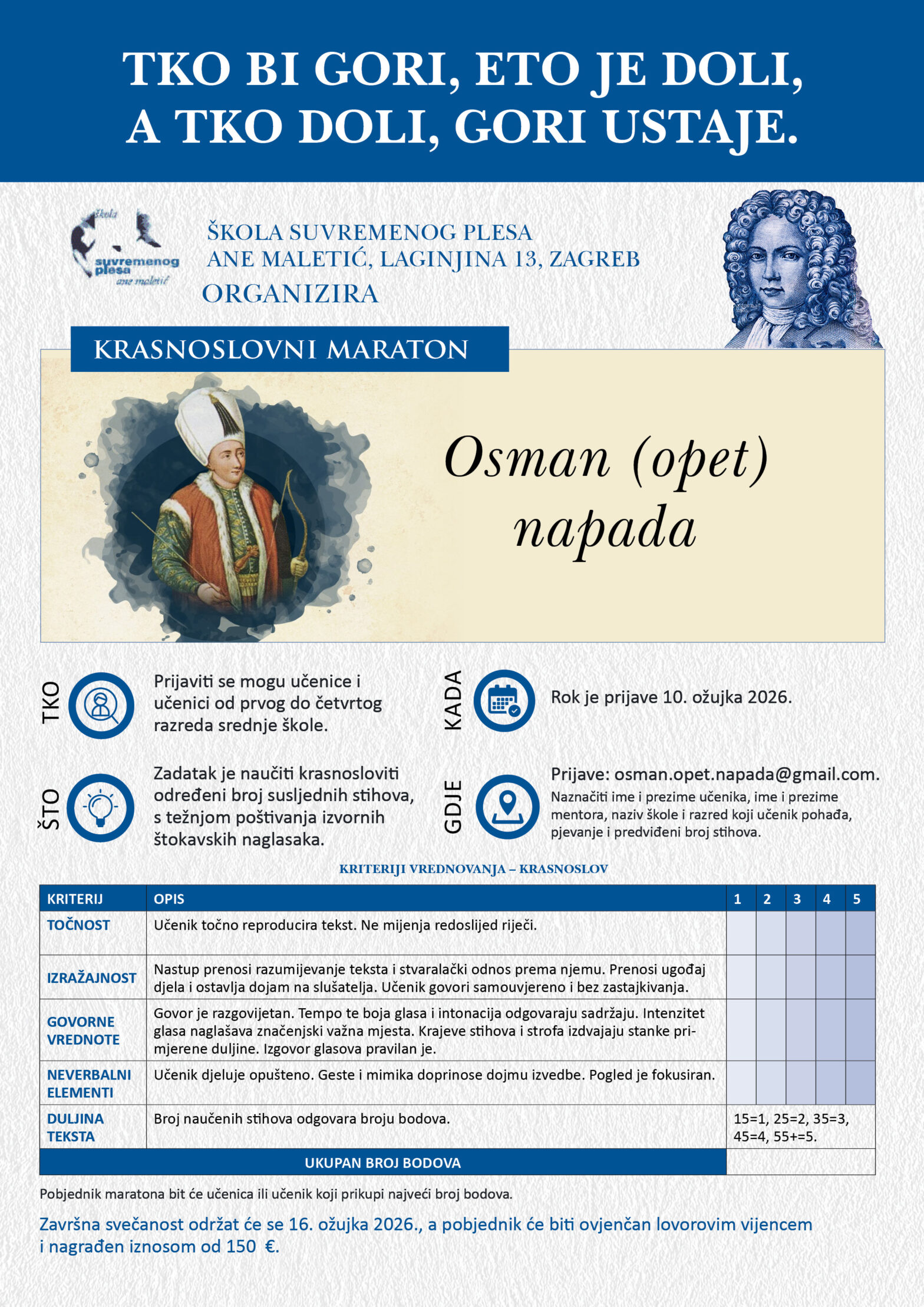 Dragi srednjoškolci! Škola suvremenog plesa Ane Maletić organizira već tradicionalni krasnoslovni maraton. Ovogodišnja tema je ,,Osman (opet) napada” pod geslom ,,Tko bi gori, eto je doli, a tko doli, gori ustaje.” Nakon uspješnog prošlogodišnjeg krasnoslovljenja Mažuranićeva spjeva Smrt Smail-age Čengića pozivamo sve učenike srednjih škola od prvoga do četvrtoga razreda da se prijave i okušaju u novom izazovu!… Nastavi čitati Krasnoslovni maraton
